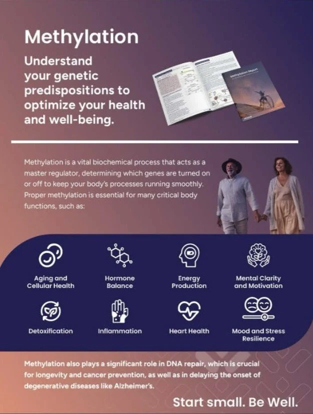 Understand your genetic predispositions to optimize your health and well- being. Methylation is a vital biomechanical process that acts as a master regulator, determining which genes are turned on or off to keep your body’s processes running smoothly. Proper methylation is essential for many critical body functions, such as: Aging and cellular health, hormone balance, energy production, mental clarity and motivation, detoxification, inflammation, heart health and mood and stress resilience. Methylation also plays a significant role in DNA repair, which is crucial for longevity and cancer prevention as well as delaying the onset of degenerative diseases like Alzheimer’s.