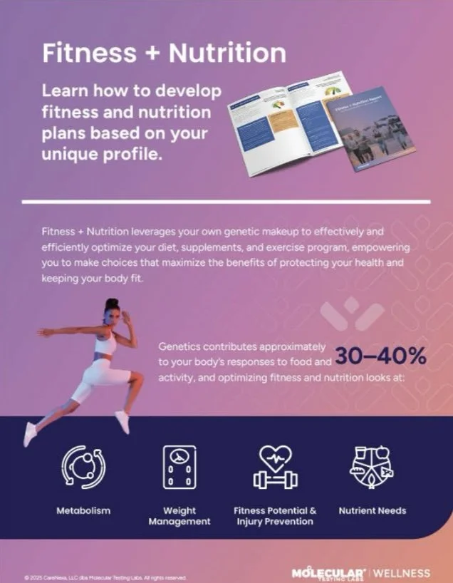 Learn how to develop your fitness and nutrition plans based on your unique DNA profile. Fitness and Nutrition leverages your own genetic makeup to effectively and efficiently optimize your diet, supplements and exercise program, empowering you to make choices that maximize the benefits of protecting your health and keeping your body fit. Genetics contributes approximately 30-40% to your body’s responses to food and activity, and optimizing fitness and nutrition looks at: Metabolism, weight management, fitness potential and injury prevention and nutrient needs.